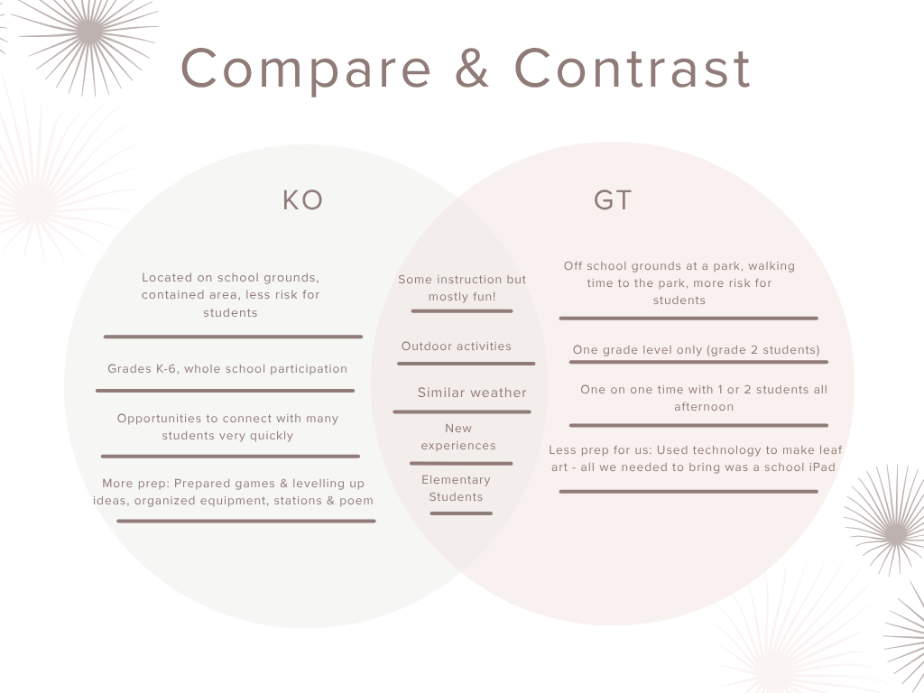 I created this Venn diagram using Canva, a digital design tool, to visually compare and contrast these experiences. This visual representation will help me reflect more deeply on the similarities and differences between the two Take Me Outside Days for my blog.