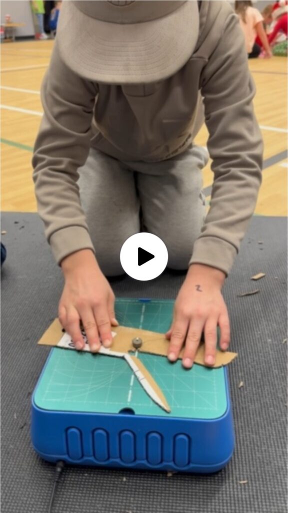 The second station I helped with was the Chomp Saw station. This station featured a kid-safe cardboard saw used to cut out airplane pieces that students would assemble into 3D models. This station was all about creativity, hands-on building, and learning how to use different tools to build a little plane.