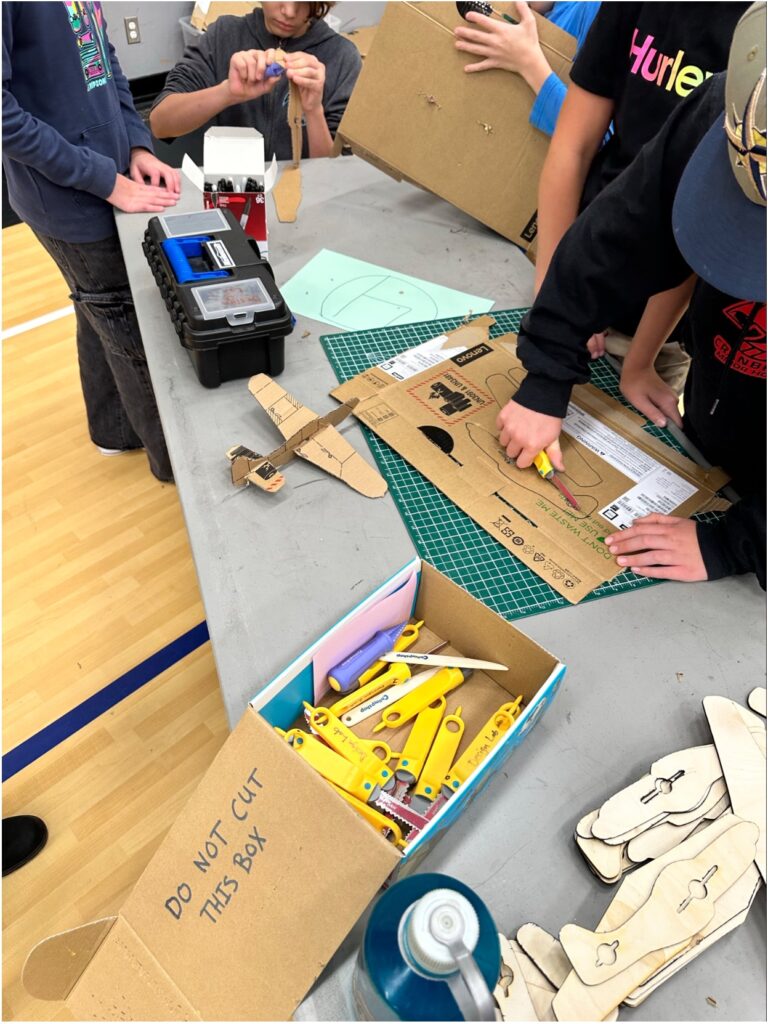 The second group was more successful because we had our system down. We explained the process upfront, guided students quickly to the chomp saws or the hole punch stations, and helped them move quickly through the steps. More students were able to complete their airplanes, and I was excited to help them get their planes finished.