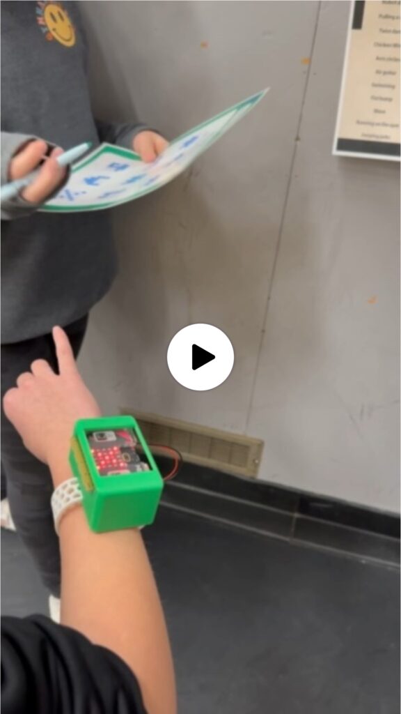 The first station I lead was the MicroBit station. This station featured an AI-powered watch that detects the wearer’s movements and flashes a picture on its display. The idea was students would put on the MicroBit watch, perform a movement such as jumping jacks, high fives, fist bumps, and more, then try to match the picture that appeared on the screen to the movement they performed.