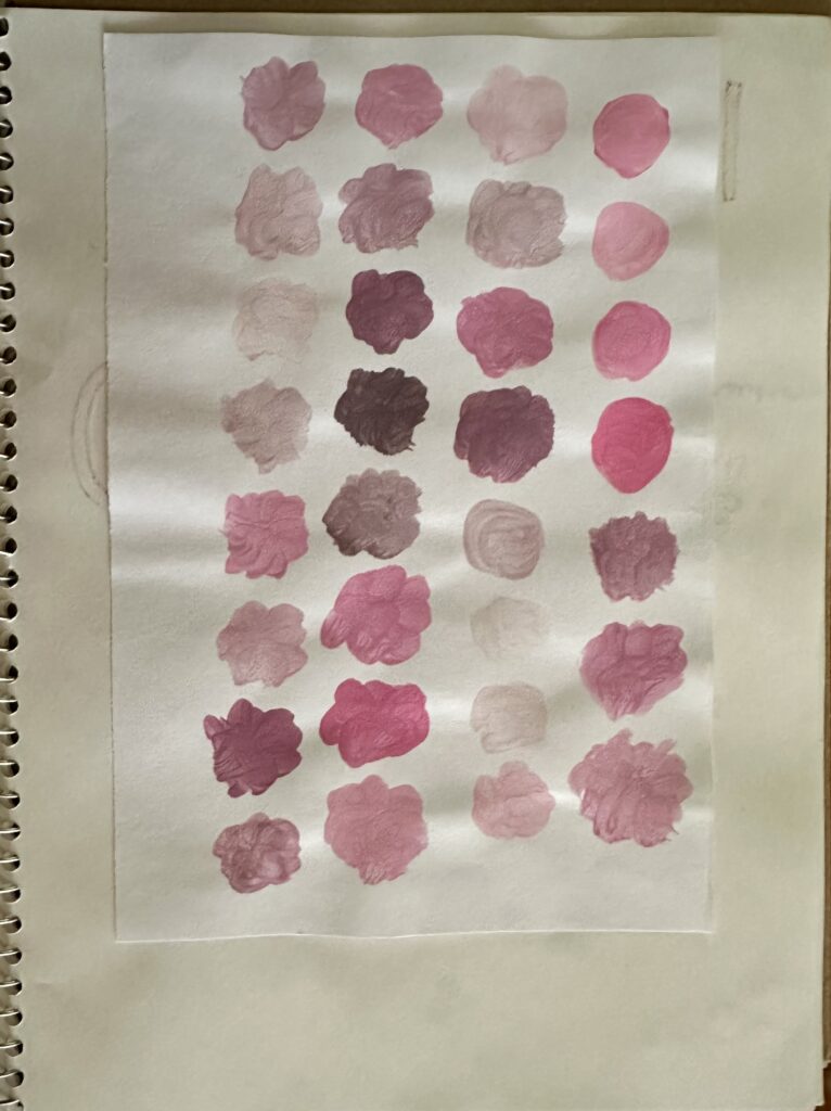 Use 3 colours to create as many shades of pink as possible. We used red, white and black.